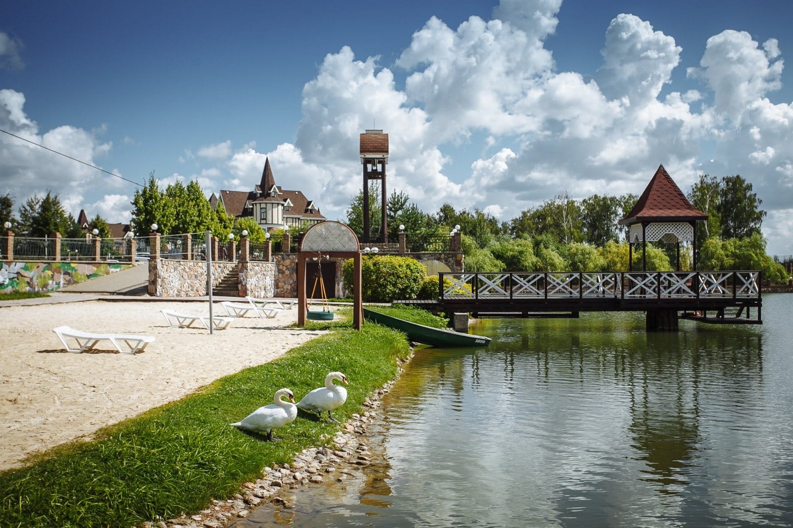 Внутри поселка расположены несколько тематических парков, озеро с лебедями и уютным рестораном, каскад прудов, песочный пляж, волейбольная площадка, площадка для выгула собак. Рядом с одним из природных озёр создана зона отдыха, где можно рыбачить и загорать на солнце.