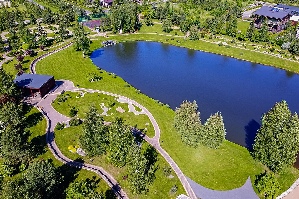 Всего в 5 минутах езды от поселка расположены детские сады и школы, фитнес клуб, салоны красоты, рестораны, супермаркеты. Общая площадь территории поселка 52 Га, на которых расположились 163 дома площадью от 350 кв. м. на участках от 17 сот. до 50 сот.